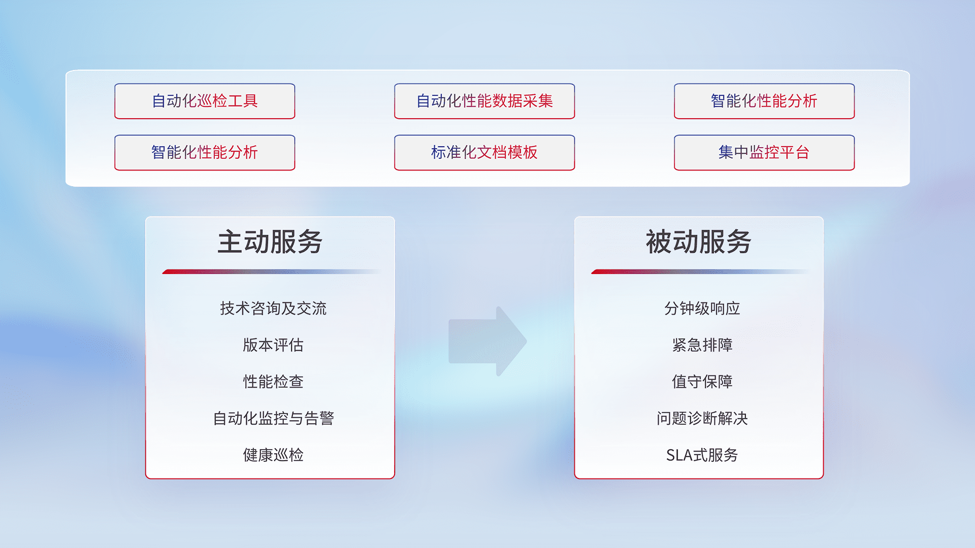 智能化工具和标准化文档,,保障服务质量,,提供主动服务(包含技术咨询、、版本评估、、、、性能检查、、、、自动化监控与告警、、健康巡检)和被动服务包含(分钟级响应、、、、紧急排障、、、值守保障、、、、问题诊断解决、、SLA服务)。。。。
